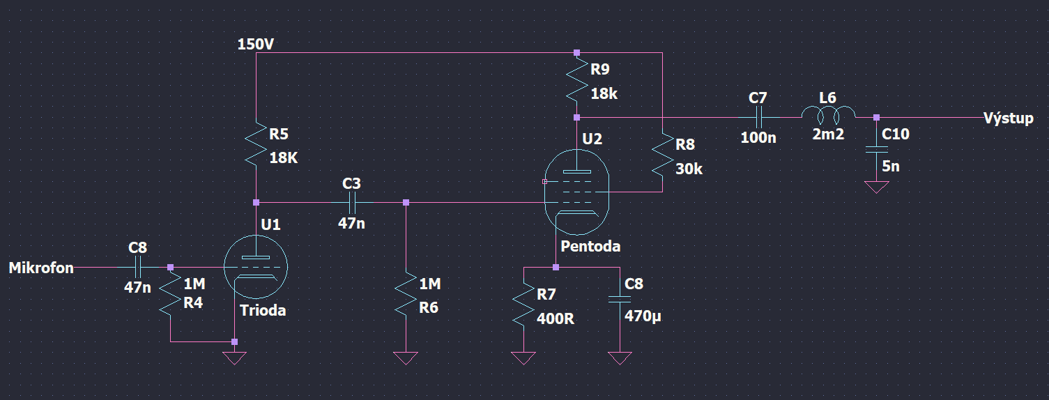 No a nakonec tu samozřejmě máme samotný zesilovač, který má dva zesilovací stupně. Trioda nemá na mřížce žádné předpětí, pentoda má asi