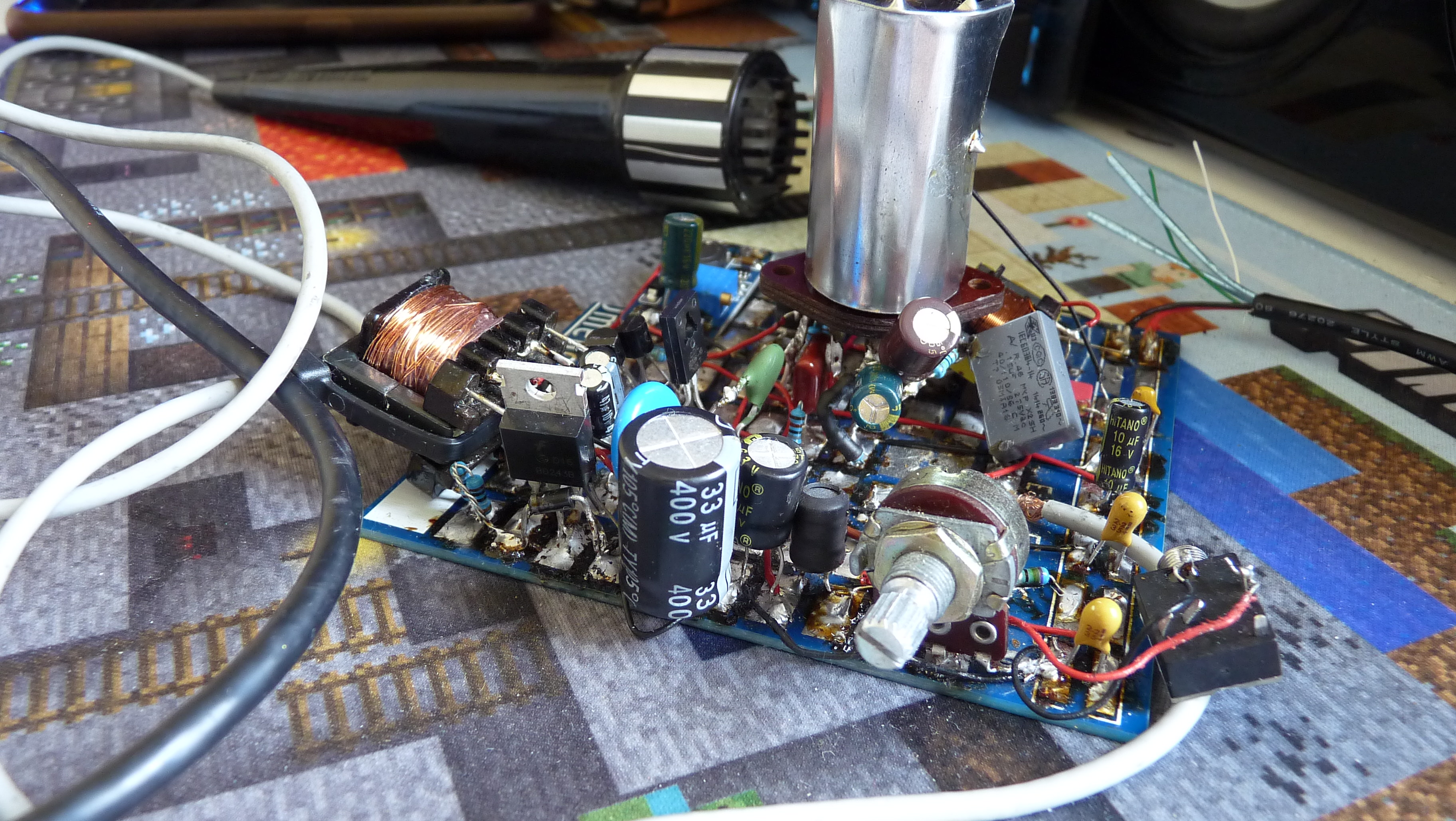 Je potřeba experimentovat s rezistorem R11 VN generátoru, množstvím závitů na transformátoru a s rezistorem R6 zdroje žhavení pro
